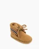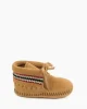 This uber soft suede bootie features a padded insole for comfort and a softsole bottom for protection and durability. Detailed braid trim and fringe decorate the cuff while the simple tie closure wraps the foot in place for a secure fit.
