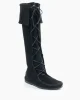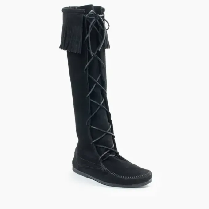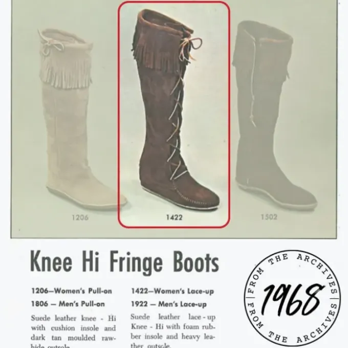 Stand out at the next festival with these iconic lace-up boots. They’re made by hand today from the same simple design that was introduced in 1968. Genuine suede is supple, soft and comfortable. These moccasin boots lace up high to just below the knee and simple fringe sways from the boot tops with every step.