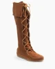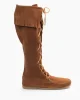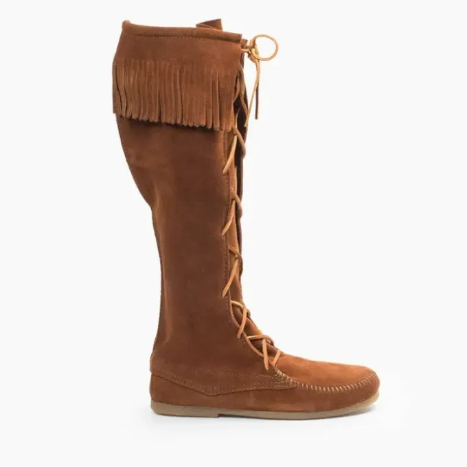 Stand out at the next festival with these iconic lace-up boots. They’re made by hand today from the same simple design that was introduced in 1968. Genuine suede is supple, soft and comfortable. These moccasin boots lace up high to just below the knee and simple fringe sways from the boot tops with every step.