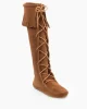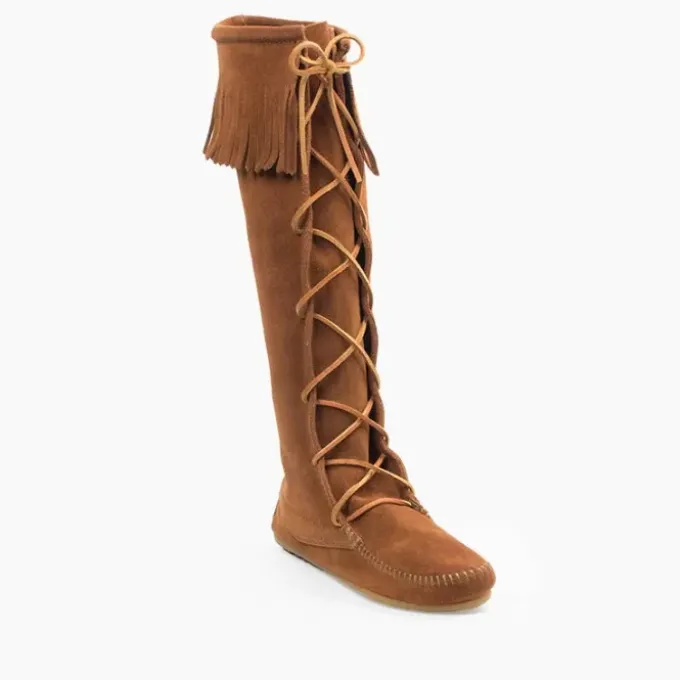 Stand out at the next festival with these iconic lace-up boots. A fashion essential for celebrities and trendsetters, these boho-chic moccasin boots lace up to just below the knee. Made by hand today from the same sleek design that was introduced in 1968. Long rawhide laces elongate your look while simple fringe dances down from the boot tops with every step.