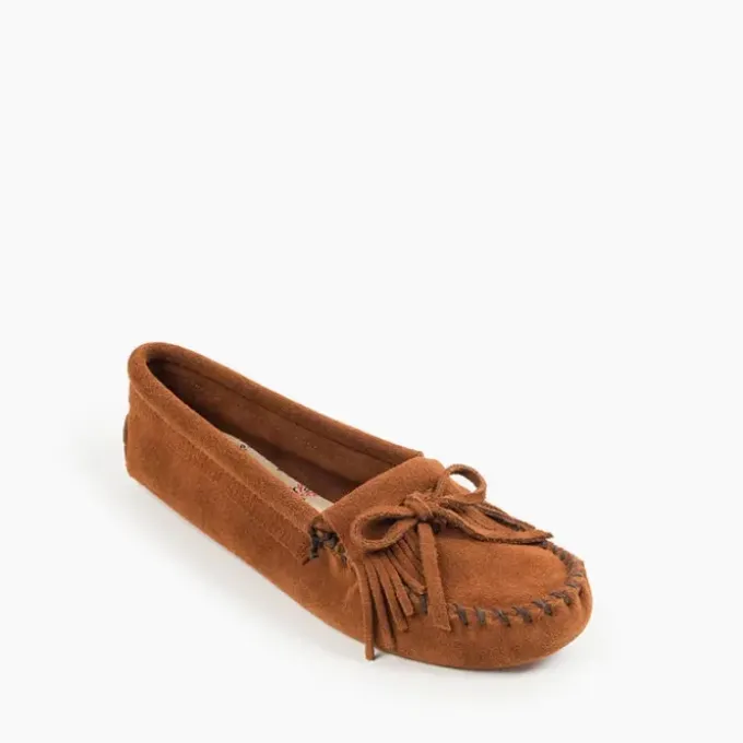 First released in 1989, our popular Kilty moccasins in the original soft sole style are the ultimate in comfortable shoes. Crafted by hand, these moccasins have an almost-barefoot feel with a dash of fringy style on top and around the collar. The highest-quality suede wraps your feet from toe to sole. This durable footwear is designed to last.