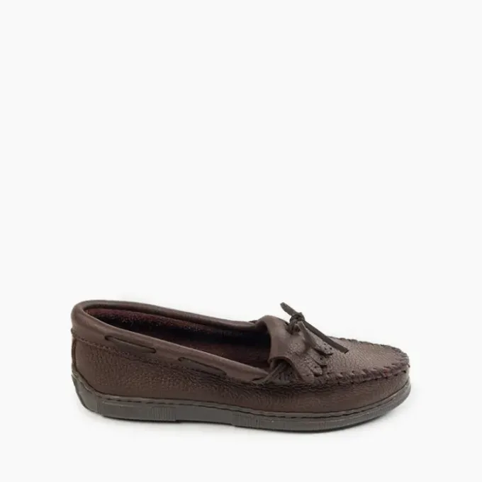 These sturdy loafers are handmade from the highest-quality moosehide, so they’re designed to last and last. Super-soft moosehide, a flexible rubber sole and fully padded insole make these flat shoes ultra comfortable and perfect for completing any casual look. Kilty fringe, hand-stitched toe details and rawhide ties finish these durable women’s shoes.