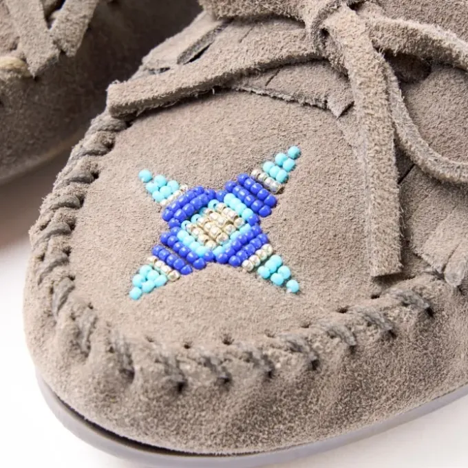 The Wicanh’pi Moc features Afton Josette Delgado’s star-inspired floral design, honoring the creation story of the Očéti Šakowin. Made with genuine suede and Minnetonka’s signature hand-stitched detailing, this moccasin blends timeless craftsmanship with cultural storytelling.