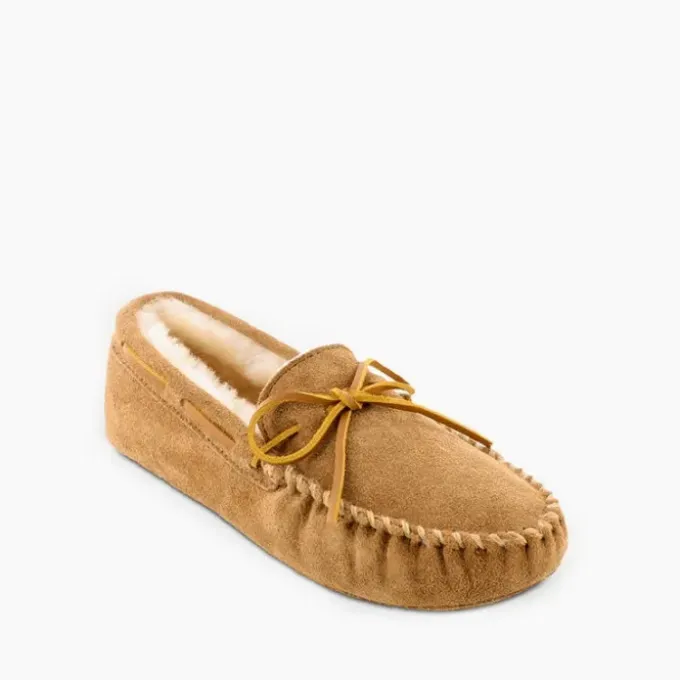 Sink into these men’s slippers after a long day and they’ll feel like blankets for your feet. The soft sheepskin lining keeps feet warm while wicking away moisture from your skin, keeping you dry and comfortable. Rawhide lacing keeps these slippers in place. The traditional softsole moccasin design makes these sheepskin slippers an absolute treat.