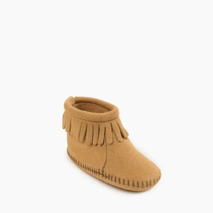 Your little darling will adore these sweet fringe infant moccasins. Soft suede leather keeps little toes warm, while the hook and loop closure promises easy on and off and a padded insole provides comfort as your little one learns to walk.