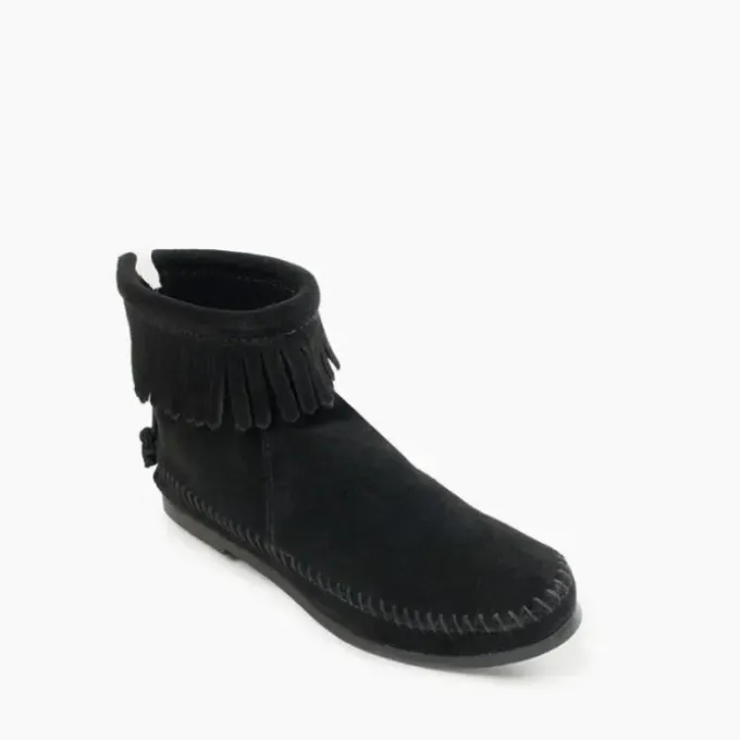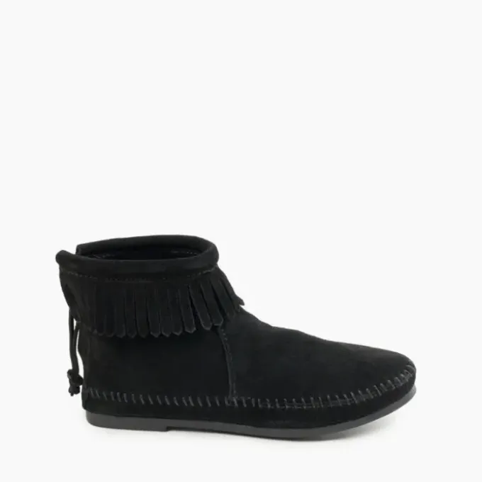 Zip up one of our most popular shoes for women first released in 1963. These trendy suede boots feature a clean and sleek silhouette with just enough of our famous fringe around the ankle to add a little pizzazz to their simple design. Wear these ankle boots with your favorite leggings or skinny jeans, just like the celebrities and trendsetters who adore this carefree and comfy style.