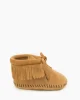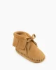 Its supple leather will form to their foot with every step while its padded footbed will keep them completely cozy in the meantime. A simple tie closure promises easy on and off. A layer of fringe and hand-stitched details make these infant moccasins beloved by children all over the world.