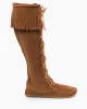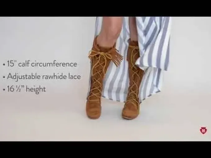 Stand out at the next festival with these iconic lace-up boots. A fashion essential for celebrities and trendsetters, these boho-chic moccasin boots lace up to just below the knee. Made by hand today from the same sleek design that was introduced in 1968. Long rawhide laces elongate your look while simple fringe dances down from the boot tops with every step.