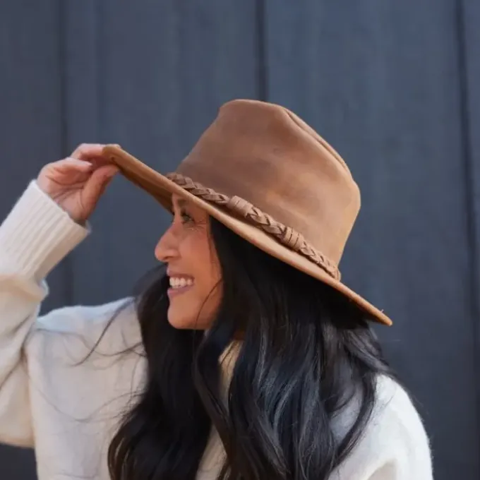 This versatile wide brimmed hat is our best-seller. Handmade from the highest-quality ruff distressed leather, this durable hat is designed to last. Create your own personalized style thanks to the steel wire thatโs hidden inside the brim. The subtle leather-braided accent gives this hat a simple touch of style. Not only does it look great, it protects you from the sun and other elements. This leather hat is a distinctive style to wear fishing, camping, hunting or on any outdoor adventure.
