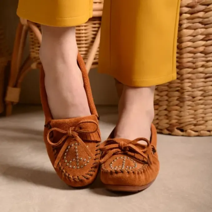 Reintroducing the Minnetonka Peace Moc. This style was originally released in 2009 and has been updated with the iconic peace sign featuring antique silver metal studs. These statement-making womenโs moccasins are sure to welcome whimsical good vibes with every step.
