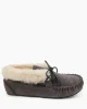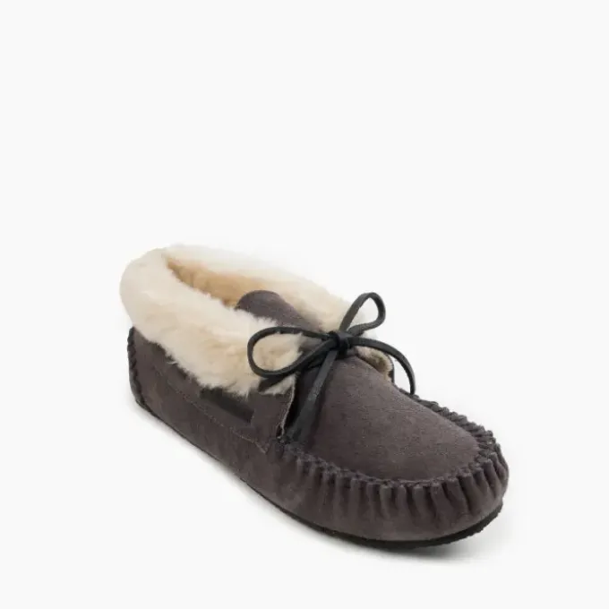 Sink into the soft pile lining that’ll keep your feet warm and comfy. These classic bootie slippers are one of our most popular styles and they make great gifts. Made by hand from genuine suede, these women’s slippers have a thin rubber sole. Leather laces tie up to keep these treats on your feet.